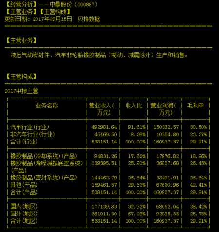中鼎份(000887)主营液压气动密封件、汽车非轮胎橡胶制品,根据2017中报主营构成比如下: