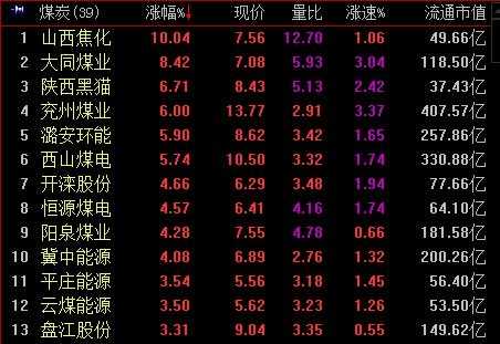 “煤炭板块”里的龙: 总共13个,分别是: 1、000968 煤 气 化 2、600997 开滦份 3、601699 潞安环能 4、000983 西山煤电 5、600395 盘江份 6、600348 阳泉煤业 7、600188 兖州煤业 8、600123 兰花科创 9、000933 神火份 10、000780 庄能源 11、600408 安泰集团 12、601666 煤份 13、600740 山西焦化 龙简介: 龙指的是某一时期在票市场的炒作中对同行业板块的其他票具有影响和号召力的票,它的涨跌往往对其他同行业板块票的涨跌起引导和示范作用。龙并不是一成不变的,它的地位往往只能维持一段时间。成为龙的依据是,任何与某只票有关的信息都会立即反映在价上。