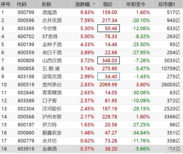 酿酒行业板块票:002304 洋河份 000603 *ST 威达 600559 老白干酒 000596 古井贡酒 600132 重庆啤酒 600519 贵州茅台600084 *ST中葡 600365 通葡份 600199 金种子酒 000858 五 粮 液 600809 山西汾酒 000995 ST皇台 000752 发展 000869 张 裕A 600702 沱牌曲酒600197 伊力特 600779 水井坊000929 兰州黄河 000729 燕京啤酒 600573 惠泉啤酒600616 金枫酒业 000568 泸州老窖 600059 古越龙山 600600 青岛啤酒 600543 莫高份 000799 酒 鬼 酒 600090 啤酒花 600238 海南椰岛 000557 ST银广夏 002461 珠江啤酒