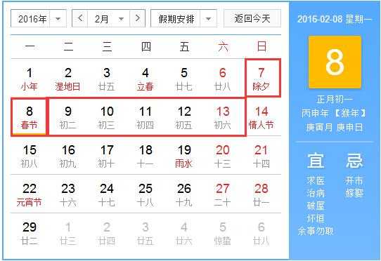 2月7日(星期日,农历除夕)、2月8日(星期一,农历正月初一)、2月9日(星期二,农历正月初二)为法定节假日