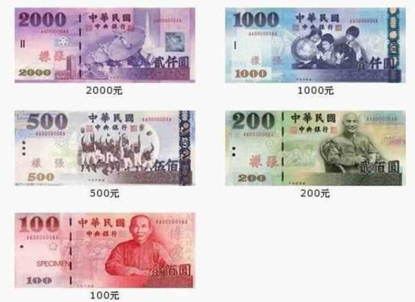 的流通货币为新台币(NT$)。 新台币的纸钞面值分成2000元、1000元、500元、200元、及100元。 则分成50元、20元、10元、5元、及1元。2000应该是有出纪念的。。。一般都是1000,肯定对的啦,我问过我的网友了。