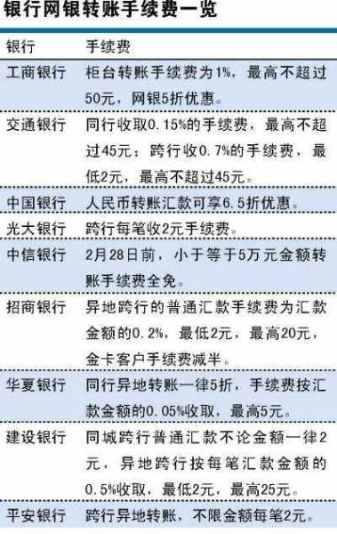 >交通:转账金额的0.15%,1元/笔,50元/笔。