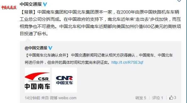 南车与北车2014年12月30日晚双双发布重组公告,正式宣布双方以南车换吸收北车的方式进行合并,合并后的新公司更名为“中车份有限公司”(以下简称“中车”)。