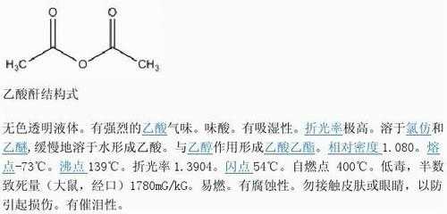 (醋酐)是一种无色透明液,有刺鼻辛辣的嗅味。与可以任一比溶解在乙醇和水中放出分解热,水解成醋酸,溶于醇、醚、等溶剂。 化式 (CH 3 CO) 2 O,结构简式如下,也称“”、“醋酐”。无色、有醋酸气味的液。熔点-73℃,沸点139℃,容易燃烧,不与水混溶,放置后水解成醋酸。溶于乙醇,并成醋酸。溶于、苯和氯仿。主要用作乙酰化剂,人造丝的原料。
