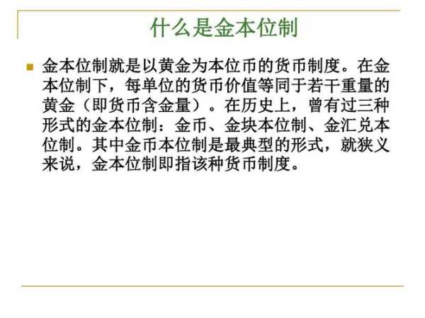 金本位制就是以黄金为本位币的货币制度。在金本位制下,每单位的货币价值等同于若干重量的黄金(即货币含金量);当不同使用金本位时,之间的汇率由它们各自货币的含金量之比——金价来决定。金本位制于19世纪中期开始盛行。在历史上,曾有过三种形式的金本位制:金币、金块本位制、金汇兑本位制。其中金币本位制是最典型的形式,就狭义来说,金本位制即指该种货币制度。