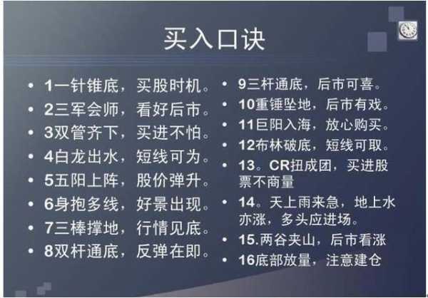 正文 股票术语 股票术语顺口溜? 财汇天下 V管理员 /2024-09-01 02:23:52 /0 评论 /79 阅读 0901 此篇文章发布距今已超过524天,您需要注意文章的内容或图片是否可用! 本文目录票术语顺口溜?市术语?(图片来源网络,侵删)票术语顺口溜?答:上涨,下跌,K线。。。都是票术语;常用术语除前面所说之外还有:外盘,内盘;跌停,一字板跌停,涨停板,一字涨停板;日线,周线,月线;跳空高开,跳空低开。。。市术语?术语太多了:开盘,收盘,大涨,大跌,蓝筹,绩优,个,K线,金叉,停盘,价,上市公司,上市,退市,翻红,翻绿,浮亏,浮盈,持仓,空仓等等。 免责声明:文章部分内容来自于网络收集,如有异议请发送邮件到管理员邮箱,并注明文章链接和问题,我们收到后会即刻删除,谢谢