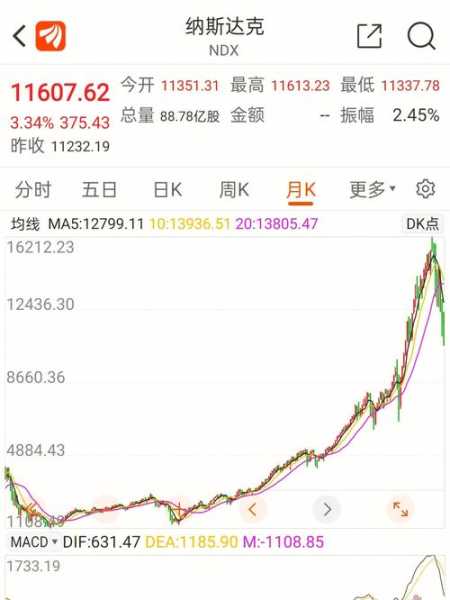 其次,可以观察纳斯达克指数的历史走势图,分析长期趋势和周期性波动。