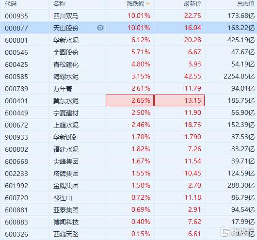 另外水泥板块还包括福建水泥、四川金顶、四川双马、华新水泥、祁连山、海螺水泥、冀东水泥、尖峰集团、西水份、江西水泥、同力水泥、狮份等等。