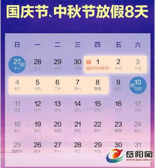 6,中秋节,国庆节10月丨日至8日放假调休一共8天,9月27日(星期日)10月10曰(星期六)上班。这些节假日加起来共27天。