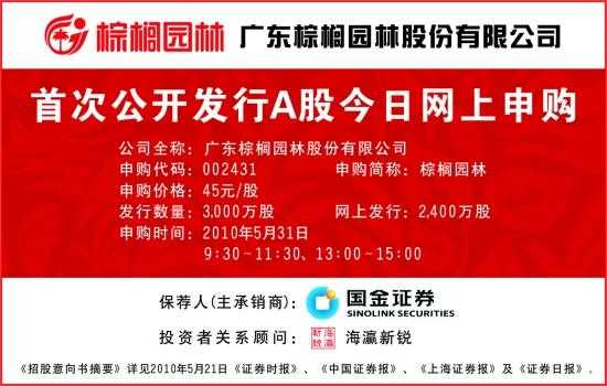 棕榈园林份有限公司(以下简称“公司”)是一家具有20多年经营历史的高新园林企业,成立于1984年的合伙企业——中山市小榄区棕榈苗圃场,1993年更名为广东棕榈园林工程有限公司,2008年6月2日,整变更为份公司,2010年6月10日公司在深圳证券交易所正式上市(票代码:002431)。
