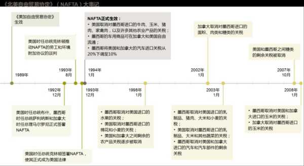北美贸易区(North American Free Trade Area,NAFTA)由美国、加拿大和墨西哥3国组成于1992年8月12日就《北美贸易协定》达成一致意见,并于同年12月17日由三国分别在各自正式签署。1994年1月1日,协定正式生效,北美贸易区宣布成立。三个会员国彼此必须遵守协定规定的原则和规则,如国民待遇、最惠国待遇及程序上的透明化等来实现其宗旨,藉以贸易障碍。