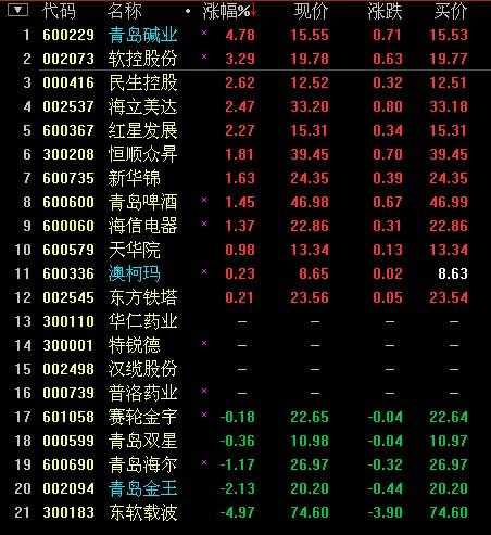 青岛的上市公司有:海信电器、青岛碱业、青岛双星 、黄海橡胶、青岛啤酒、青岛海尔等。