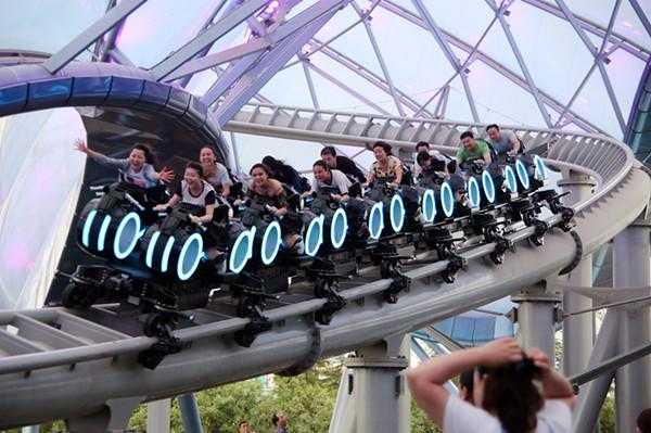 过山车项目,但是和一般大型游乐园里的过山车相比,只能称得上入门级别的,所有的斜坡前都会有刹车,所以速度不快,失重感不强。