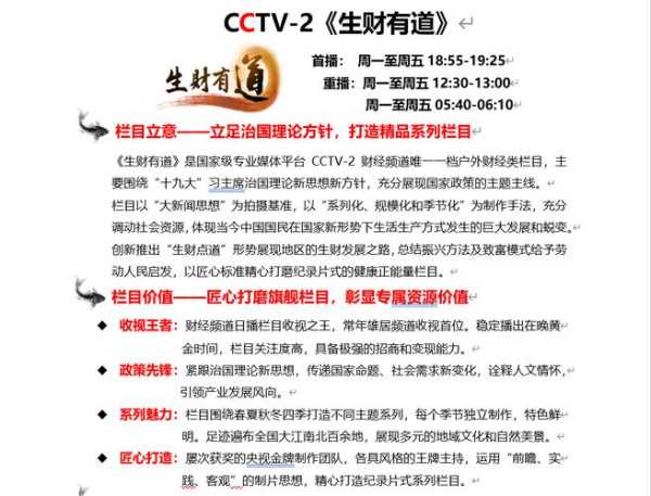>《生财有道》是央视财经频道一档大众财经专题栏目,专注于农村致富专题的制作,挖拨指导性的致富故事,为农民朋友习交流致富经验提供更多的实际帮助。时长三十分钟,给观众呈现了无数喜闻乐见创业生财的故事,它关注大众创业者,既符合时代要求又接地气,深受观众的喜爱。