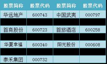 武夷(000797) 紫光份(000938) 天坛生物(600161) 华夏建通(600149) 华业地产(600240) 旅游(000802) 城建(600266)。