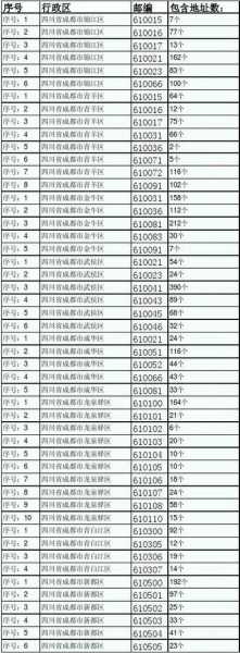 青羊区610000;锦江区610000;金牛区610000;武侯区610000;成华区610000;龙泉驿区610100;青白江区610300;新都区610500;温江区611100;双流区610200;郫都区611700;金堂县610400;浦江县610600;都江堰市611800;邛崃市611500;大邑县611300;新津县611400;彭州市611900;崇州市611200;简阳市641400。