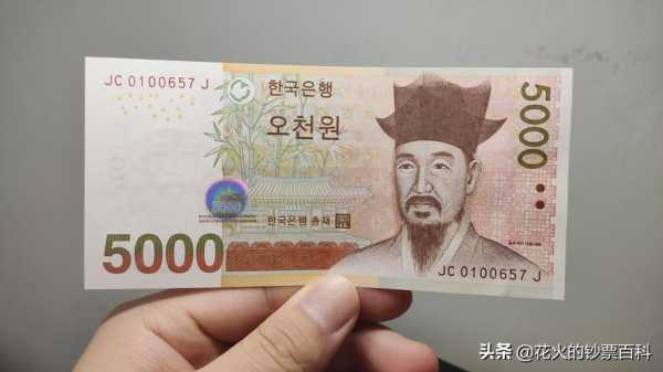 4、根据2019年12月05日汇率,50000000韩元 = 295850人民币,1人民币 = 16004563韩元。流通纸币。1000圆(正面:退溪李滉肖像、背面:溪上静居图)。5000圆(正面:栗谷李珥肖像、背面:草虫图)。