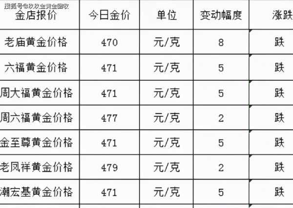 3、元/克 0 平的 今天金价小幅下跌,黄金回收价也是,跌幅2元/克。同时,每个品牌的回收价格也不一样。小金大致整理了几个。有关详细信息,请参见下表。